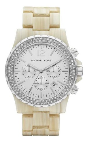 Michael Kors Women's MK5598, This white horn acetate Michael Kors watch features a sparkling topring and a chronograph function.